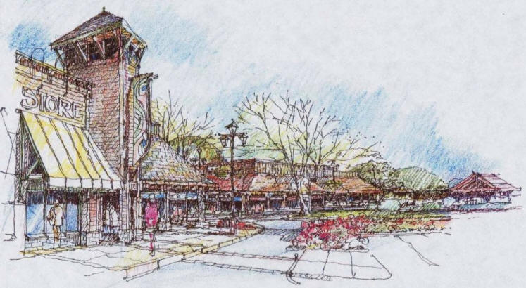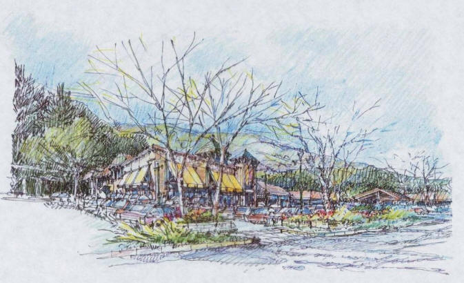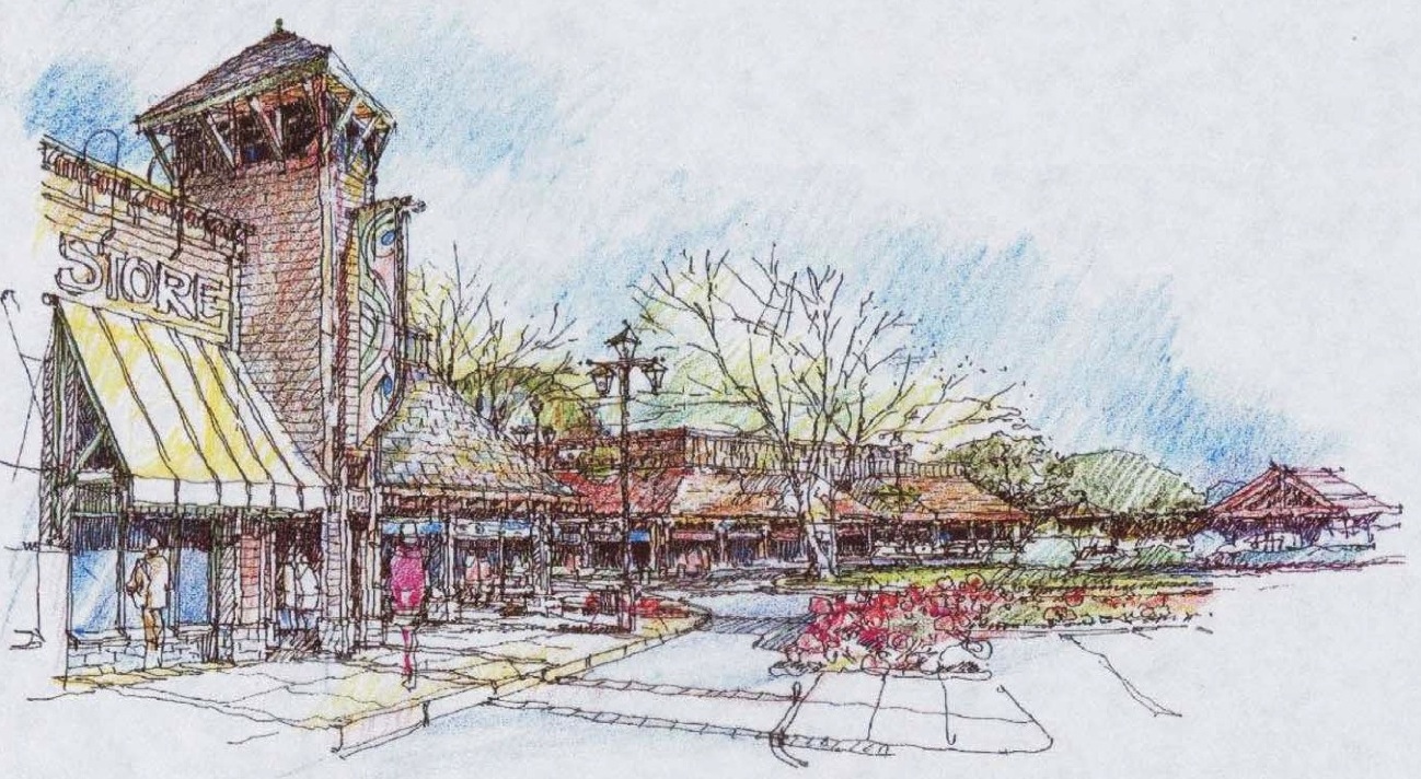 Rendering of retail buildings 1, 2 and 3 looking eastward.