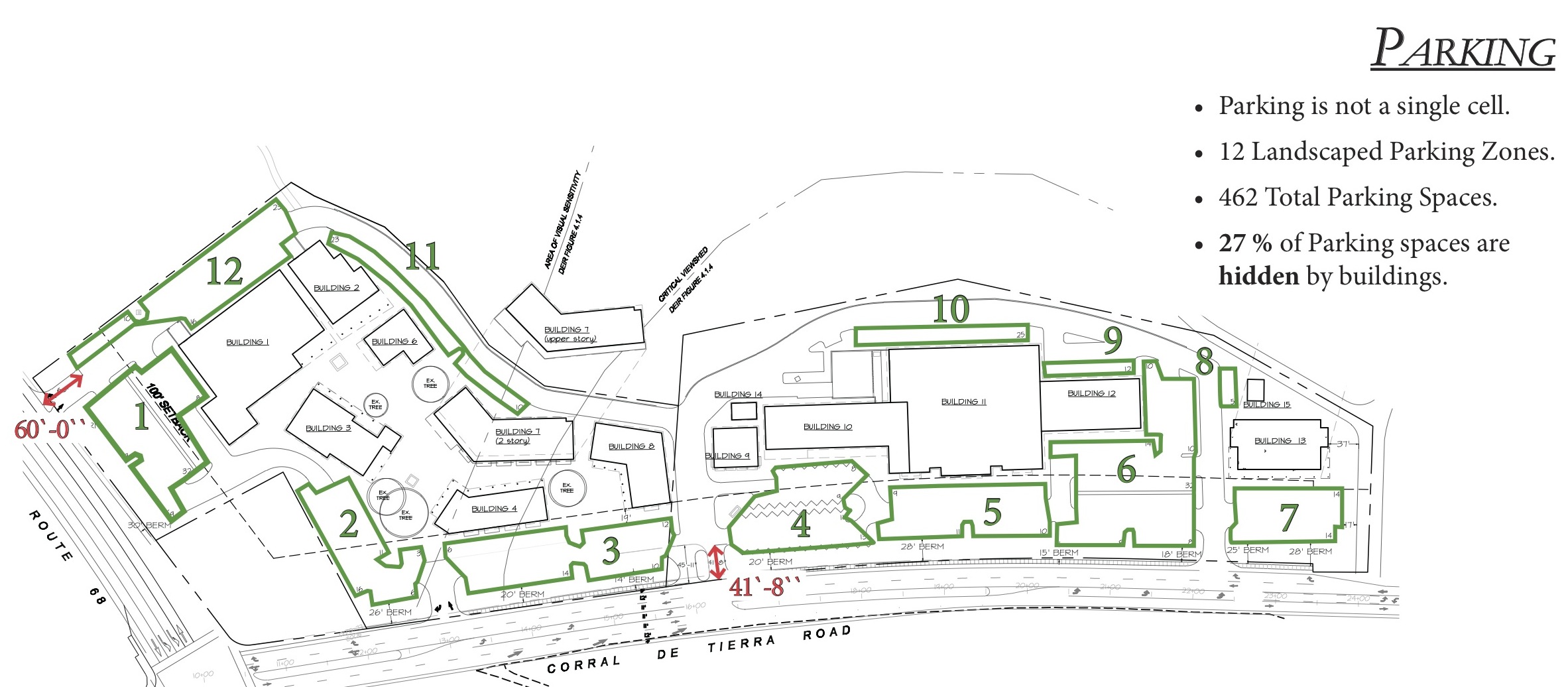 is subdivided into 12 landscaped parking zones with 27% of the parking hidden behind the buildings. There